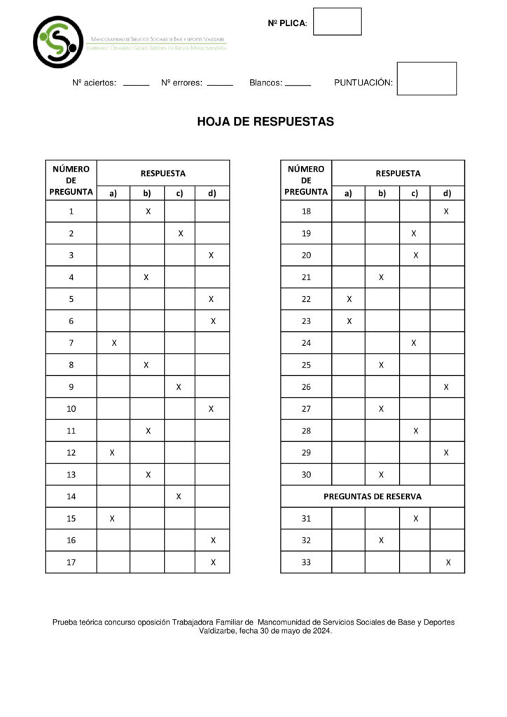PLANTILLA DE RESPUESTAS DEL EXAMEN DEL PUESTO DE TRABAJADORA FAMILIAR por Mancomunidad de Servicios Sociales Base de Valdizarbe | Jun 3, 2024 | Sin categoría | 0 Comentarios Enviar comentario Cancelar la respuestaTu dirección de correo electrónico no será publicada. Los campos obligatorios están marcados con *Comentario Nombre * Correo electrónico * Web Guarda mi nombre, correo electrónico y web en este navegador para la próxima vez que comente.