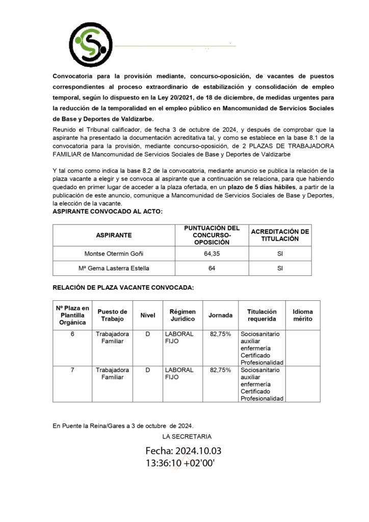 Elección de vacantes de las plazas de Trabajadora Familiar por Mancomunidad de Servicios Sociales Base de Valdizarbe | Oct 4, 2024 | Sin categoría | 0 Comentarios Enviar comentario Cancelar la respuestaTu dirección de correo electrónico no será publicada. Los campos obligatorios están marcados con *Comentario Nombre * Correo electrónico * Web Guarda mi nombre, correo electrónico y web en este navegador para la próxima vez que comente.