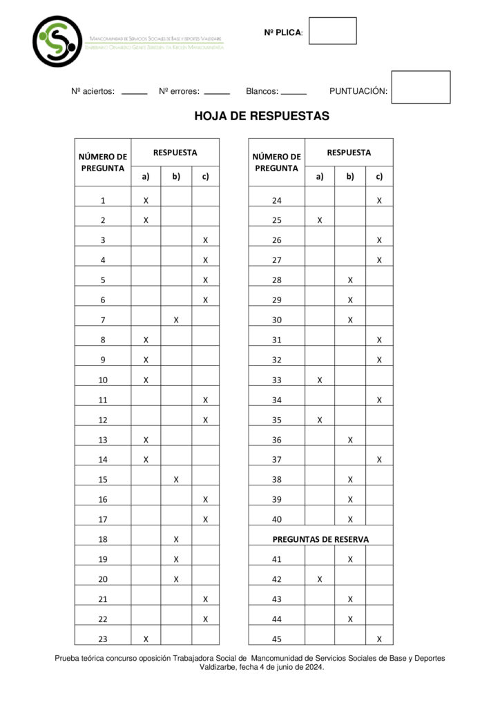 PLANTILLA DE RESPUESTAS DE LA PARTE TEST DEL EXAMEN DEL PUESTO DE TRABAJADORA SOCIAL