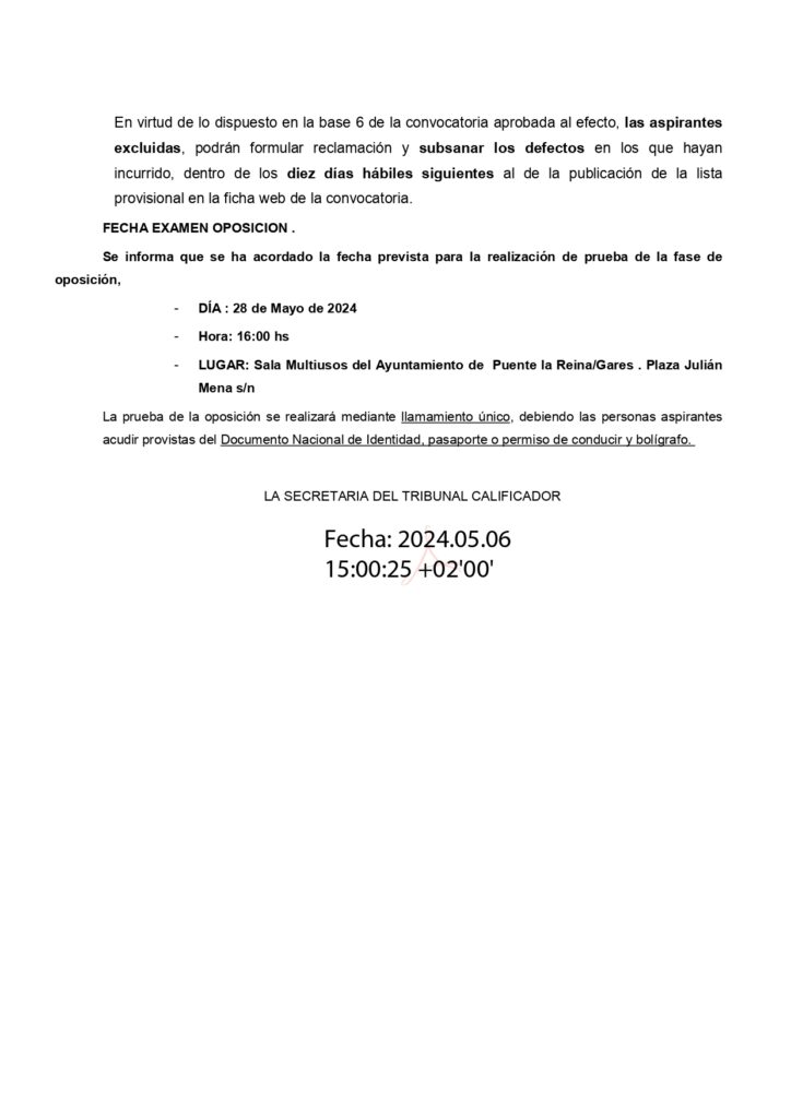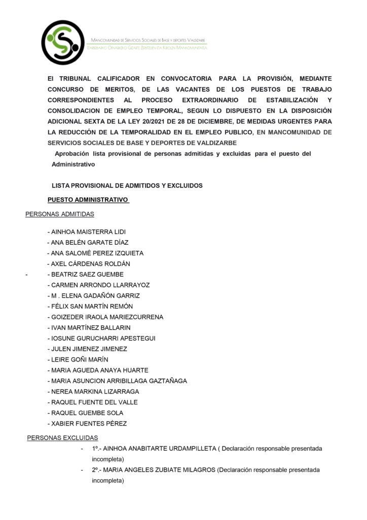 LISTA PROVISIONAL DE ADMITIDOS Y EXCLUIDOS DEL PUESTO DE ADMINISTRATIVO