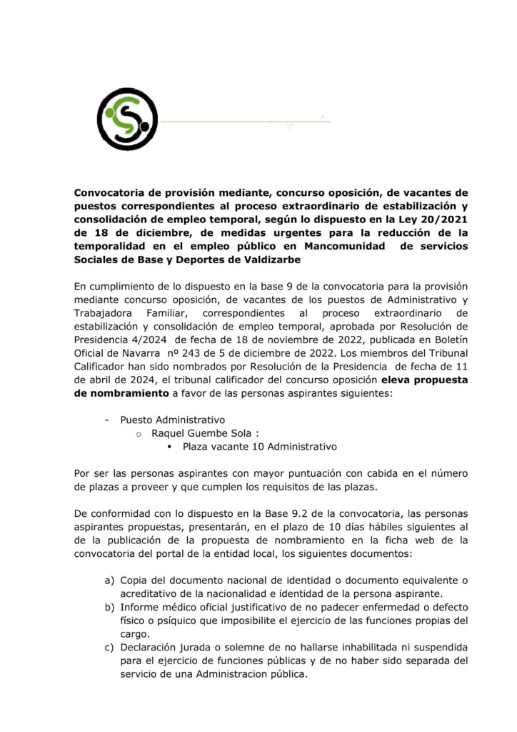 Propuesta nombramiento concurso oposición Administrativa por Mancomunidad de Servicios Sociales Base de Valdizarbe | Oct 14, 2024 | Sin categoría | 0 Comentarios Enviar comentario Cancelar la respuestaTu dirección de correo electrónico no será publicada. Los campos obligatorios están marcados con *Comentario Nombre * Correo electrónico * Web Guarda mi nombre, correo electrónico y web en este navegador para la próxima vez que comente.