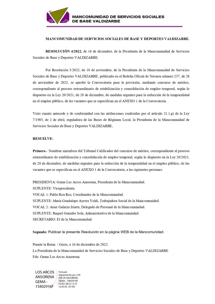 TRIBUNAL DE LAS CONVOCATORIAS DE ESTABILIZACIÓN MEDIANTE CONCURSO PARA MANCOMUNIDAD DE SERVICIOS SOCIALES Y DEPORTES VALDIZARBE por Mancomunidad de Servicios Sociales Base de Valdizarbe | Dic 19, 2022 | Sin categoría | 0 Comentarios Enviar comentario Cancelar la respuestaTu dirección de correo electrónico no será publicada. Los campos obligatorios están marcados con *Comentario Nombre * Correo electrónico * Web Guarda mi nombre, correo electrónico y web en este navegador para la próxima vez que comente.