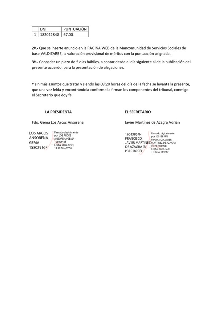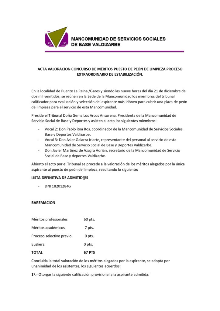 ACTA DE VALORACIÓN PROVISIONAL DEL PUESTO DE PEÓN LIMPIEZA por Mancomunidad de Servicios Sociales Base de Valdizarbe | Dic 21, 2022 | Sin categoría | 0 Comentarios Enviar comentario Cancelar la respuestaTu dirección de correo electrónico no será publicada. Los campos obligatorios están marcados con *Comentario Nombre * Correo electrónico * Web Guarda mi nombre, correo electrónico y web en este navegador para la próxima vez que comente.