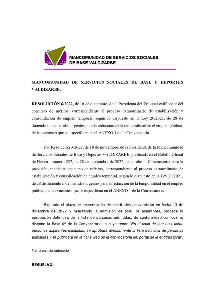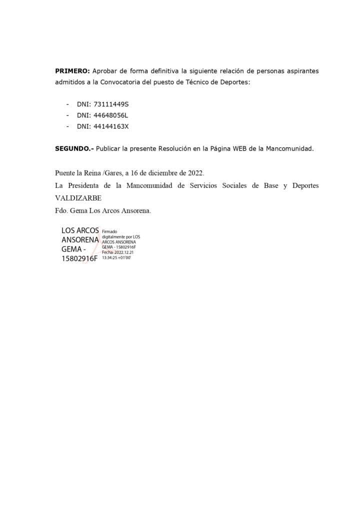 RESOLUCIÓN LISTA DEFINITIVA ADMITID@S PUESTO DE TÉCNICO DE DEPORTES