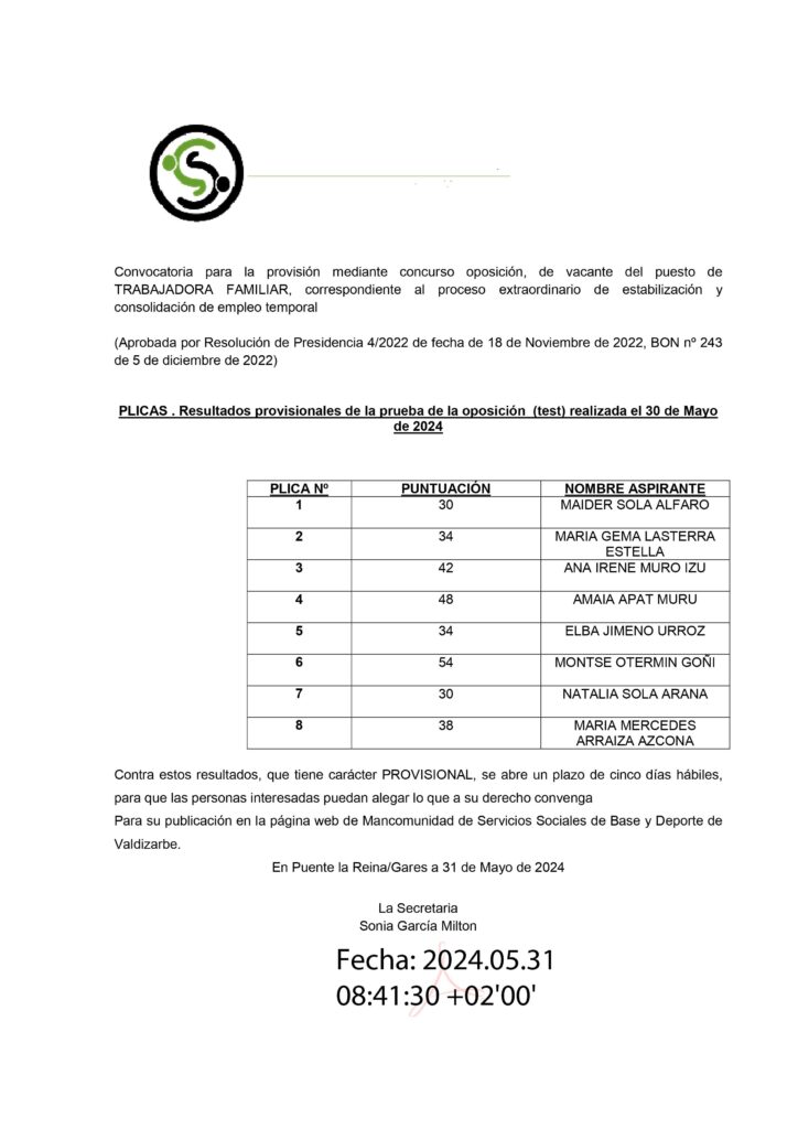 APERTURA DE PLICAS CON LOS NOTAS PROVISIONALES DE LA OPOSICIÓN DE LOS PUESTOS DE TRABAJADORA FAMILIAR